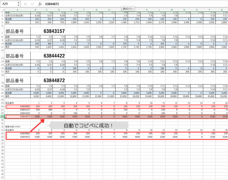 4. 同じっ部品番号の列にコピーした列をペーストする。