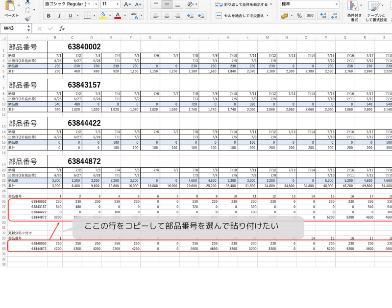 これを今までは変更があった部品の行をコピーして、Excelの表に反映されている列に部品番号を選んで貼り付けると言うやり方をとっていました。