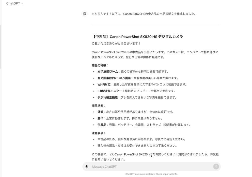 しかし、文章を書くのが苦手だったり、時間がない場合には、ChatGPTを活用することで簡単に質の高い商品説明を作成することができます。