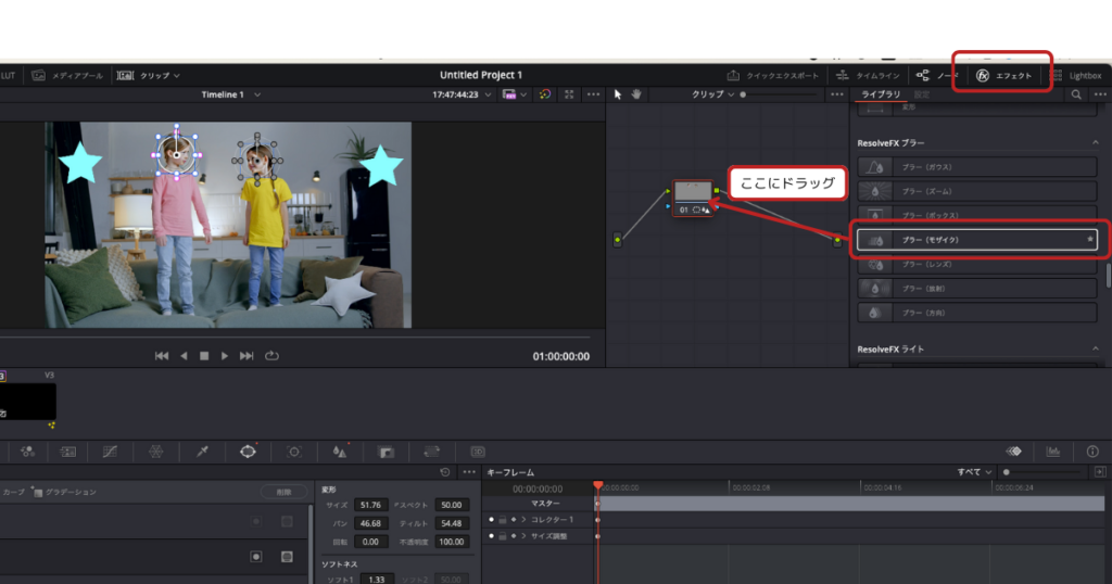 - モザイクエフェクトの選択: 「Mosaic Blur」または「Pixelate」エフェクトを見つけて、クリップにドラッグ&ドロップします。