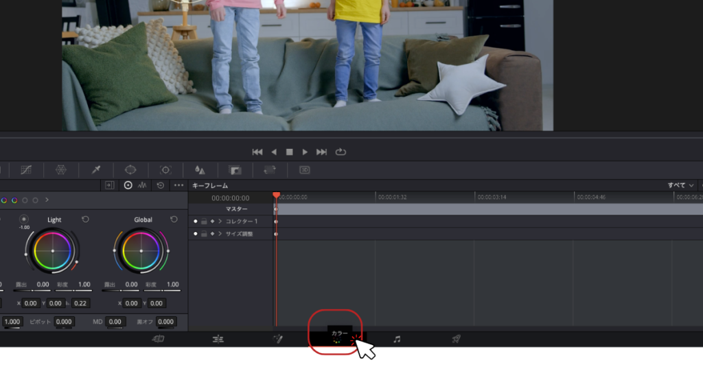 画面下部の「Color」タブをクリックして、カラーグレーディングインターフェースに移動します。
