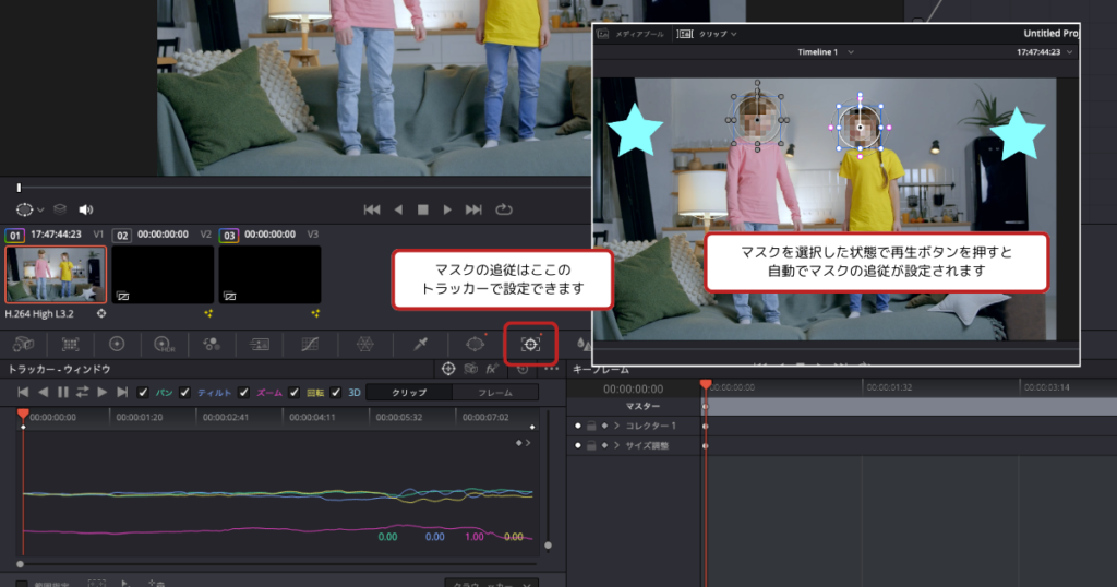 もしモザイクをかける対象が動いている場合、トラッキング機能を使ってマスクを対象に追従させることができます。トラッキングボタンをクリックして、自動的に追従させます。