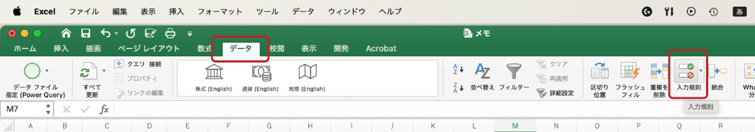 「データ」タブをクリックし、「データツール」グループの「データの入力規制」をクリックします。