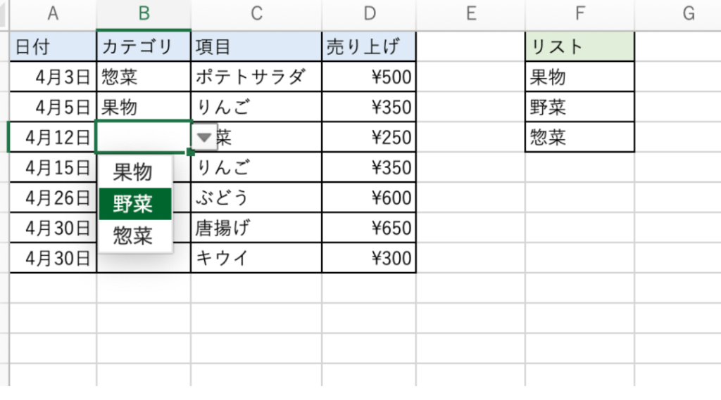 入力規制の一環として、リスト(ドロップダウンリスト)を使用すると、ユーザーはあらかじめ設定された選択肢からデータを選ぶことができ、入力ミスを減らすことができます。