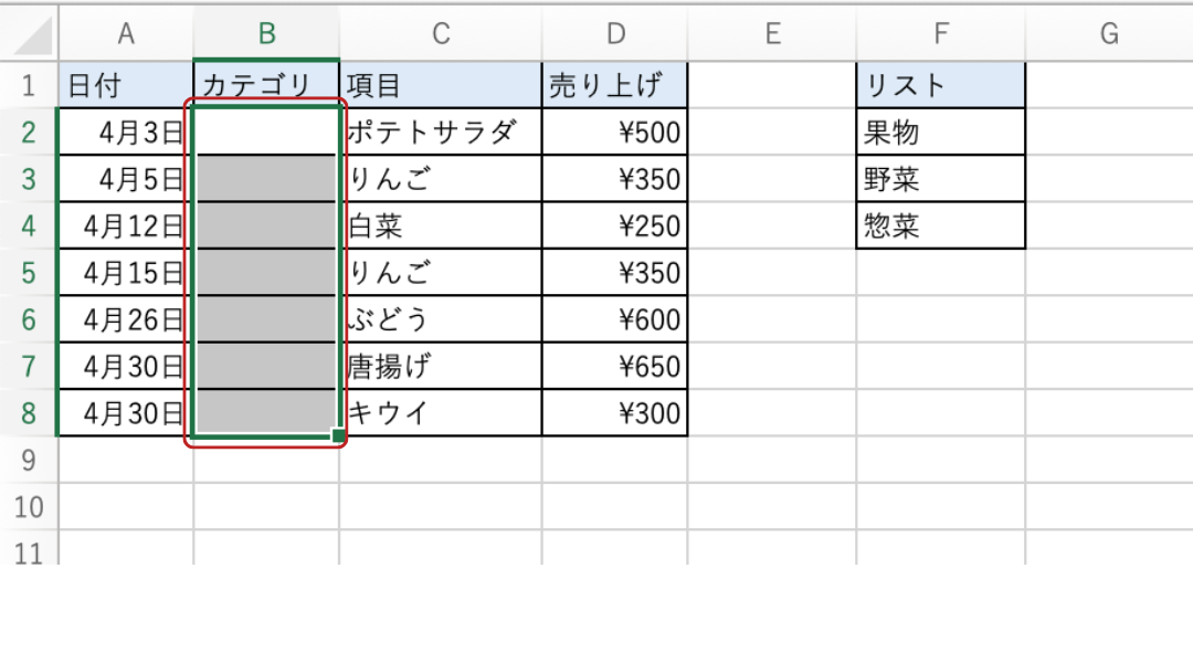 例えば、シートの適当な範囲に「果物・野菜・惣菜」といったデータを入力します。