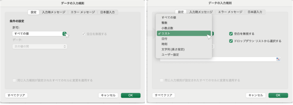 「条件の設定」のドロップダウンリストから「リスト」を選択します。