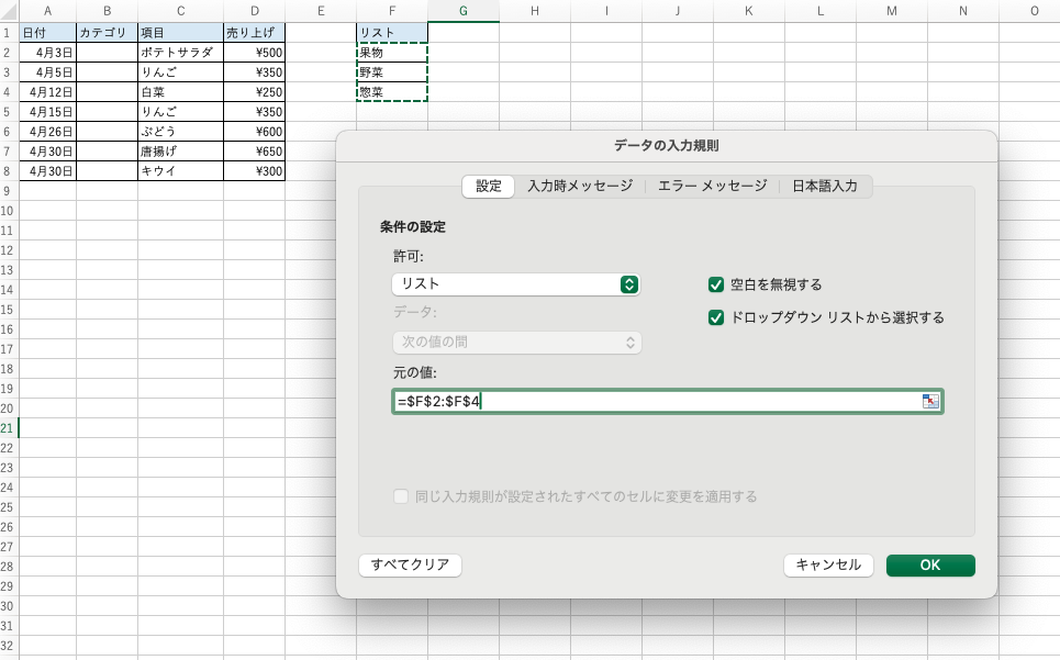 「=$F$2:$F$4」と入力、またはクリックで範囲指定します。