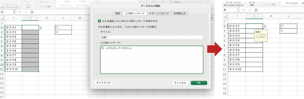 「入力メッセージ」タブで、セルが選択されたときに表示されるヒントメッセージを設定できます。
