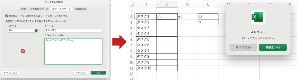 「エラーメッセージ」タブで、無効なデータが入力されたときに表示されるメッセージを設定できます。これにより、ユーザーに何が問題かを知らせることができます。