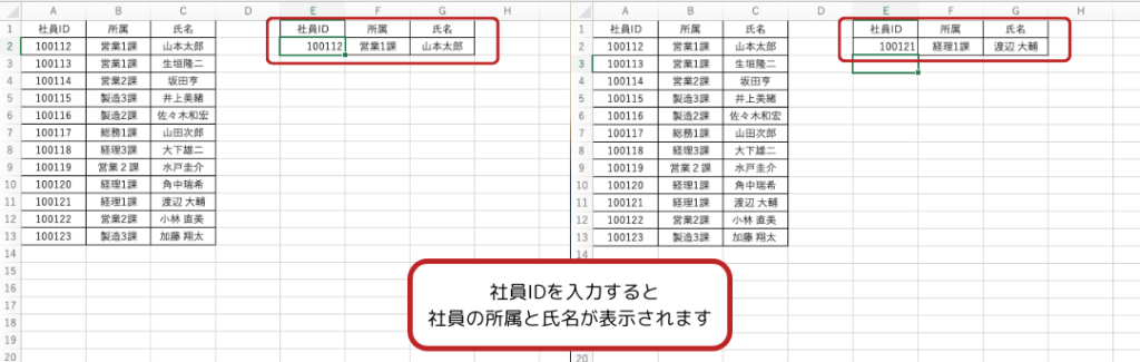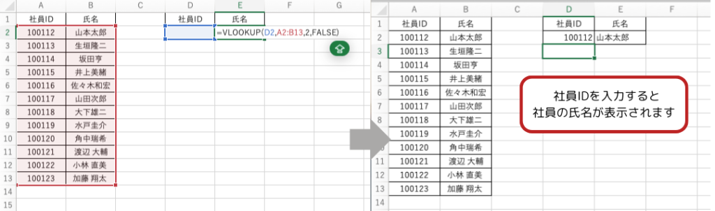例 社員IDに基づいて、社員名を検索する場合: