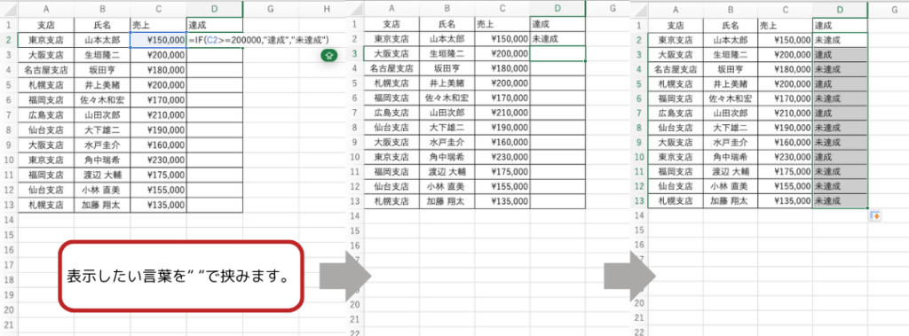 =IF(C2 >= 200000, “達成”, “未達成”)