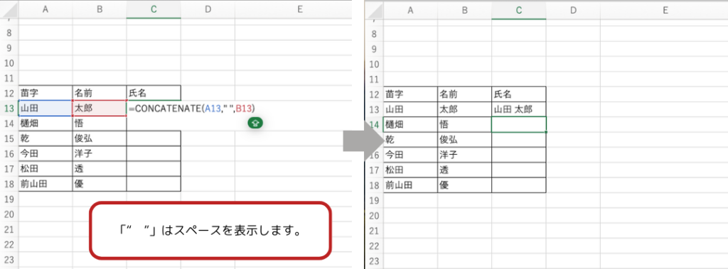=CONCATENATE(A13, ” “, B13)
