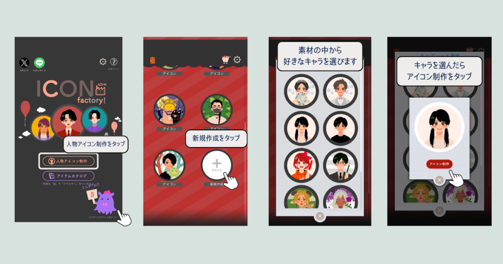 初心者でも迷うことなく操作できるように設計されており、アイコン作成の基本的なステップを順番にガイドしてくれます。